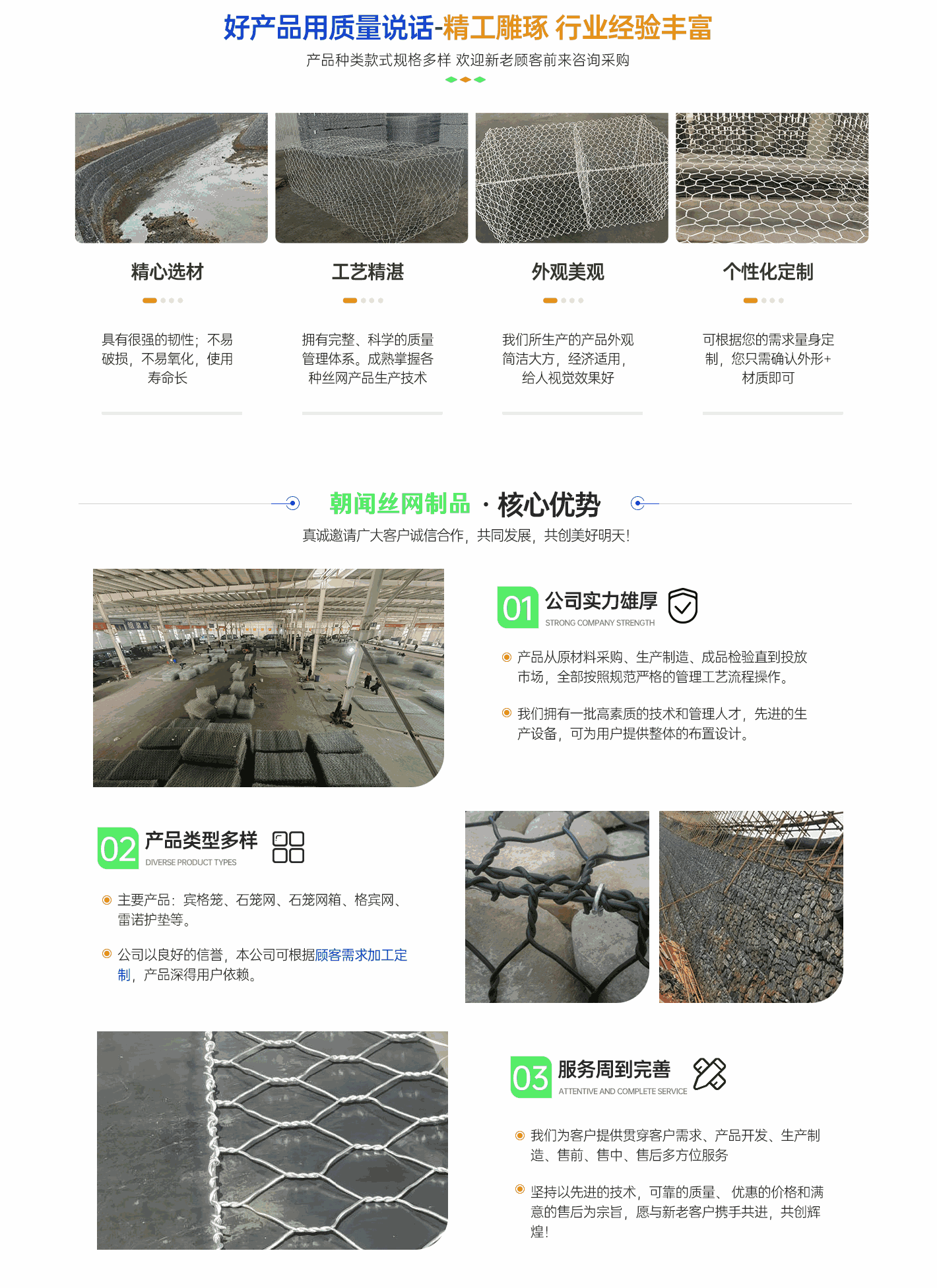 深州市朝聞絲網(wǎng)制品有限公司擁有“中國絲網(wǎng)之鄉(xiāng)”美譽(yù)的河北省致力于生產(chǎn)銷售格賓網(wǎng),雷諾護(hù)墊,景觀石籠網(wǎng),邊坡防護(hù)網(wǎng),綠濱墊,固濱籠的廠家,規(guī)格多種多樣。 我廠堅(jiān)持技術(shù)創(chuàng)新、科學(xué)管理、誠信經(jīng)營,注重引進(jìn)新型生產(chǎn)技術(shù)設(shè)備,推行標(biāo)準(zhǔn)化生產(chǎn),采用質(zhì)量管理體系,從原材料采購、生產(chǎn)管理、產(chǎn)品檢測(cè)等關(guān)鍵環(huán)節(jié)嚴(yán)格把關(guān),確保了產(chǎn)品質(zhì)量,贏得了客戶的信賴。我公司秉承“誠信、務(wù)實(shí)、高效”的企業(yè)宗旨,真誠希望與世界各地客戶互惠互利,共創(chuàng)美好未來!多年來"以誠立廠","以質(zhì)興業(yè)"。 憑借過硬的質(zhì)量、良好的信譽(yù)、優(yōu)質(zhì)的服務(wù)、合理的價(jià)格不斷拓展市場(chǎng),誠摯的希望在平等互利,坦誠相待的基礎(chǔ)上與國內(nèi)外客戶長(zhǎng)期合作!...